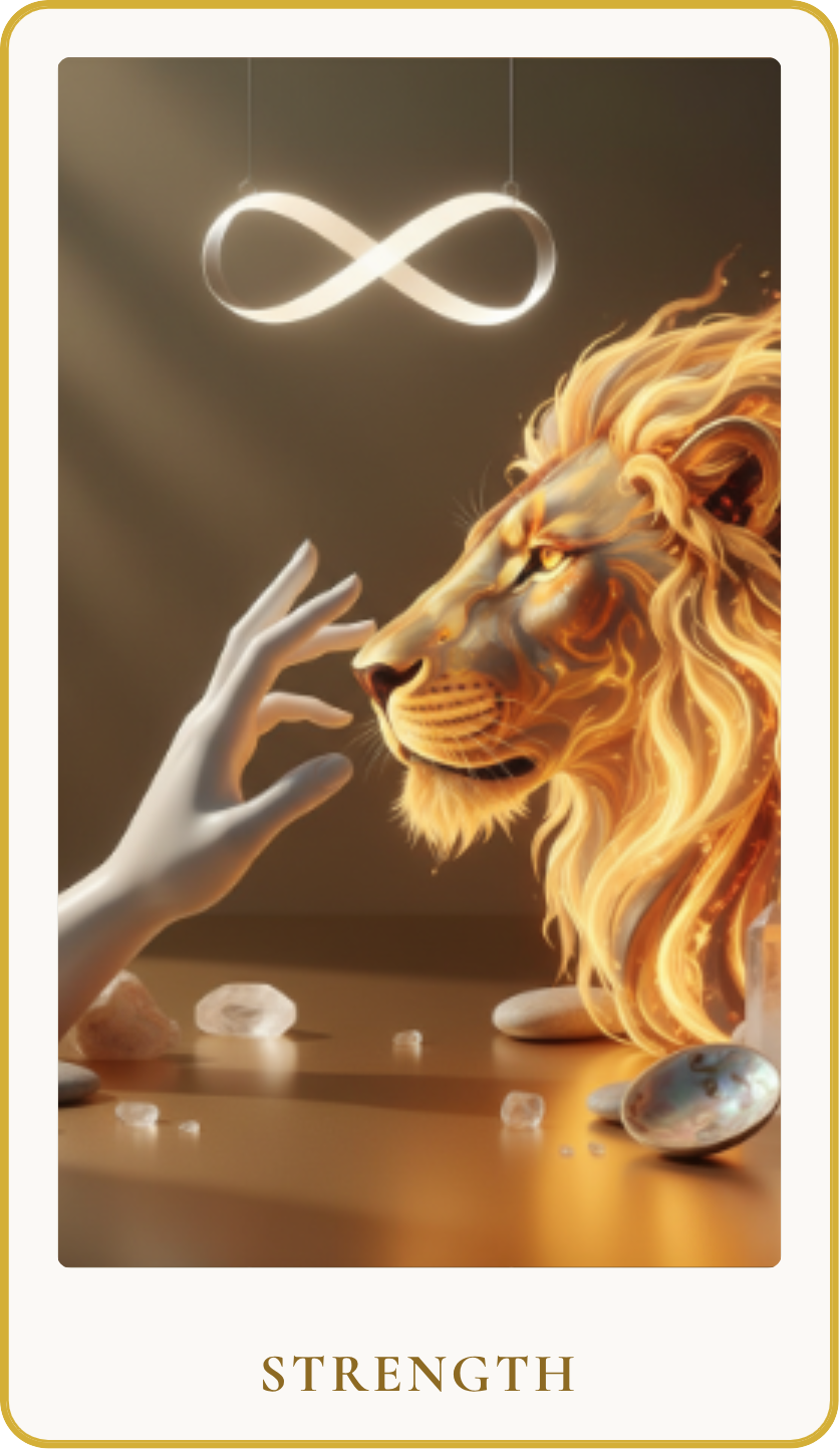 Strength speaks to the ability to face challenges with grace, empathy, and persistent fortitude. It encourages us to approach difficult situations or internal struggles with a blend of gentle determination and profound understanding, acknowledging our wilder nature while guiding it towards constructive ends. This card is about resilience, compassion, and the quiet triumph of the spirit over raw impulse, asserting the power of love and perseverance over conflict and fear.