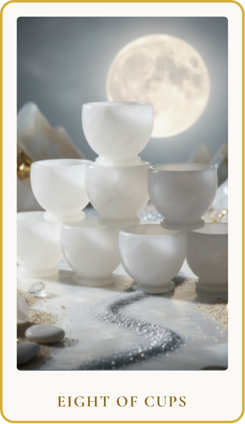 The Eight of Cups signifies a deliberate departure from a situation that, while seemingly complete or stable, no longer offers genuine emotional or spiritual fulfillment. It represents a turning point where one recognizes an inner void despite outward appearances of contentment. This card is about an internal call to seek deeper meaning, even if it means leaving behind what has been built or accumulated.