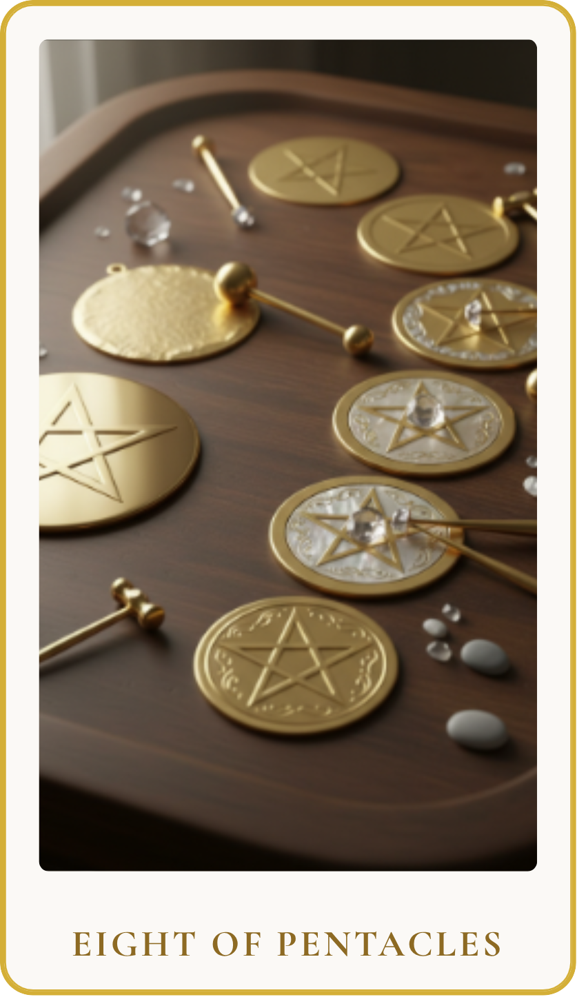 The Eight of Pentacles is a card of diligent work, dedication, and skill development. It depicts an individual focused on their craft, meticulously working on each pentacle with a clear purpose and intent. This card emphasizes the importance of practice, apprenticeship, and the methodical application of effort to achieve mastery. It speaks to the satisfaction found in honest labor, the pursuit of excellence, and the steady accumulation of skills that lead to tangible results. It’s about the journey of becoming proficient, understanding that true expertise comes from focused, repetitive, and intentional action.