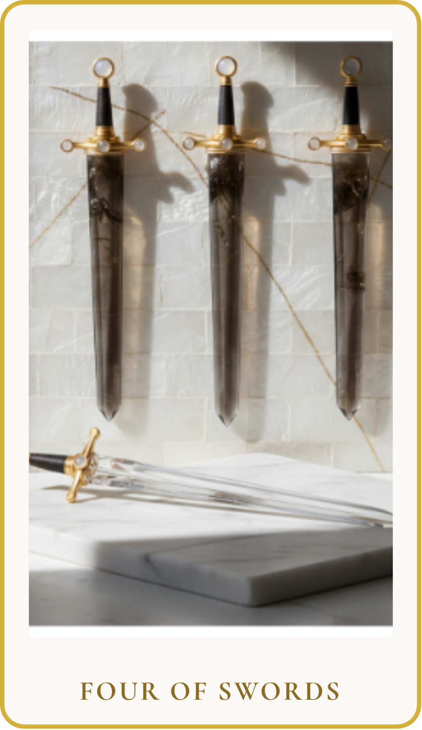 The Four of Swords signifies a necessary period of rest, recuperation, and quiet contemplation. It often appears when you've been through a challenging phase and require a strategic withdrawal to process events, heal, and gather your strength. This card is not about permanent retreat, but a temporary pause for mental and emotional recovery before re-engaging with the world.