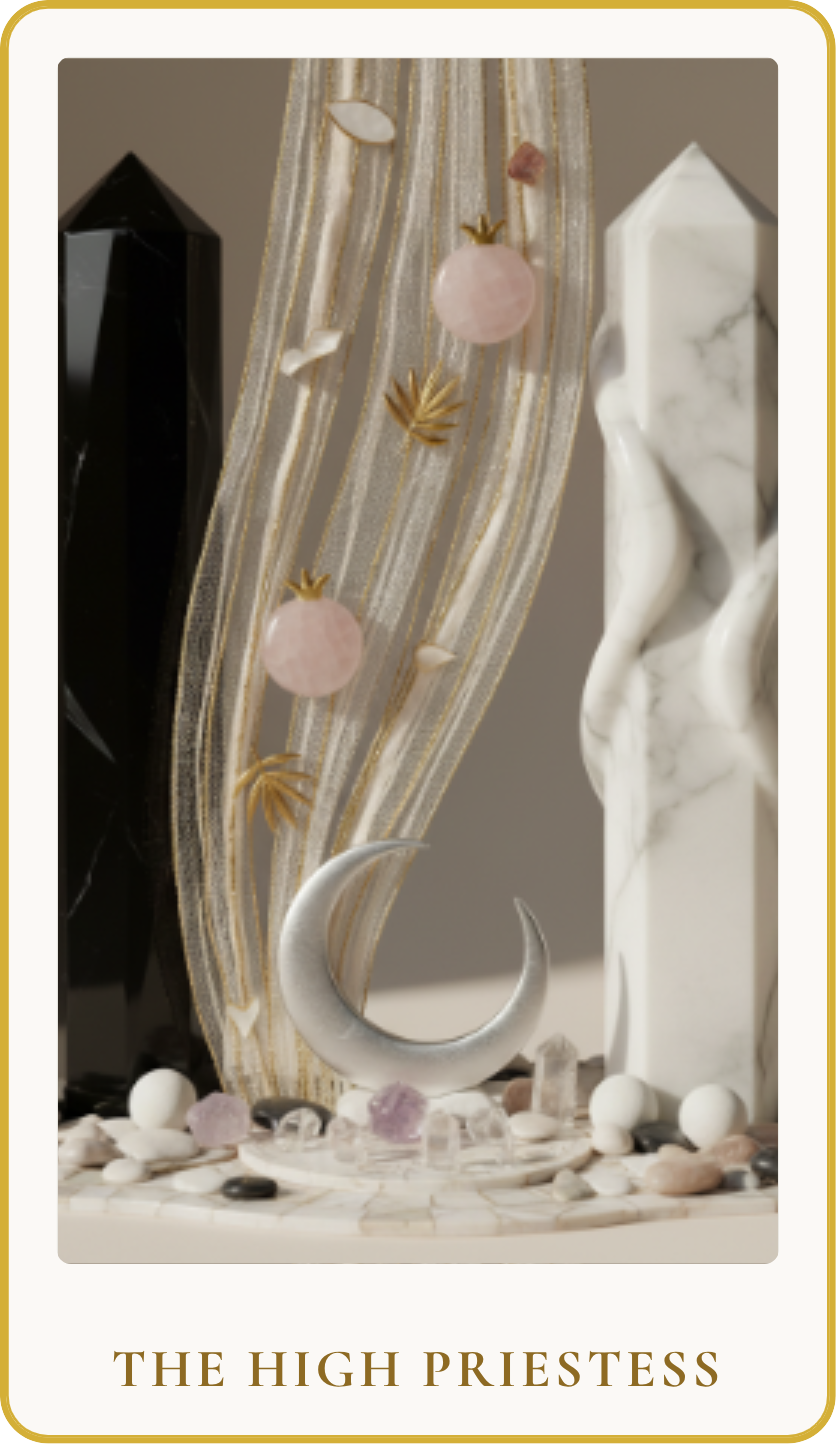 The High Priestess is the profound embodiment of intuition, mystery, and the deep well of the subconscious mind. She represents the sacred gateway to inner wisdom, urging us to look beyond superficial appearances and connect with our most profound instincts. Seated majestically between two pillars—often symbolizing duality, the conscious and unconscious, or light and shadow—she holds a scroll of hidden knowledge, the Tora, partially concealed. Behind her, a veil adorned with pomegranates hints at the unseen realms and the sacred secrets that lie just beyond our everyday perception.
