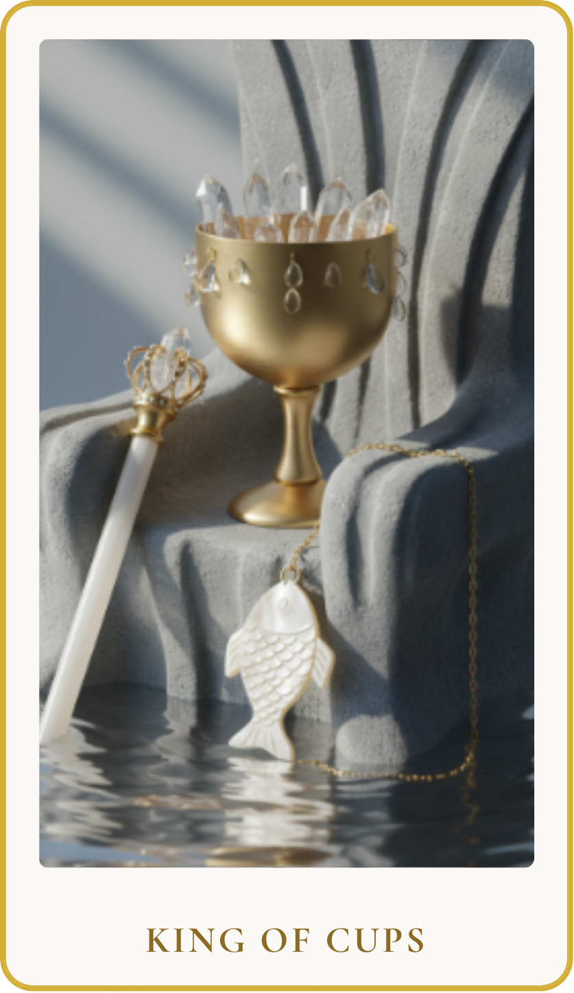The King of Cups represents emotional maturity, profound compassion, and unwavering calm amidst life's currents. He is the master of his emotional domain, demonstrating a balanced approach to feelings rather than being swayed by them. This card embodies a wise and understanding figure who can navigate complex emotional situations with grace and offer guidance with a steady hand. He symbolizes controlled emotions, intuition, and the ability to empathize deeply without becoming overwhelmed.