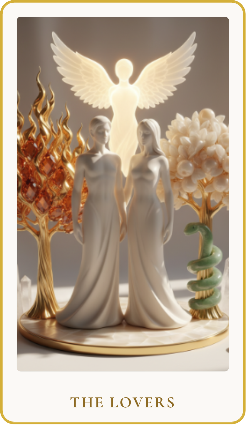 he Lovers card embodies a pivotal moment of choice and the integration of personal values. At its heart, this card represents the conscious decisions we make that shape our relationships, align with our core beliefs, and determine our path forward. It symbolizes the union of disparate elements—whether people, ideas, or aspects of the self—into a harmonious whole, driven by a deep understanding of what truly matters to us. This is not merely about romantic love, but about the profound connections and commitments forged when our inner and outer worlds are in sync. The classic imagery often depicts figures overseen by an angelic presence, standing between paths, illustrating the fundamental choice between earthly desires and spiritual alignment, inviting us to weigh our options carefully.