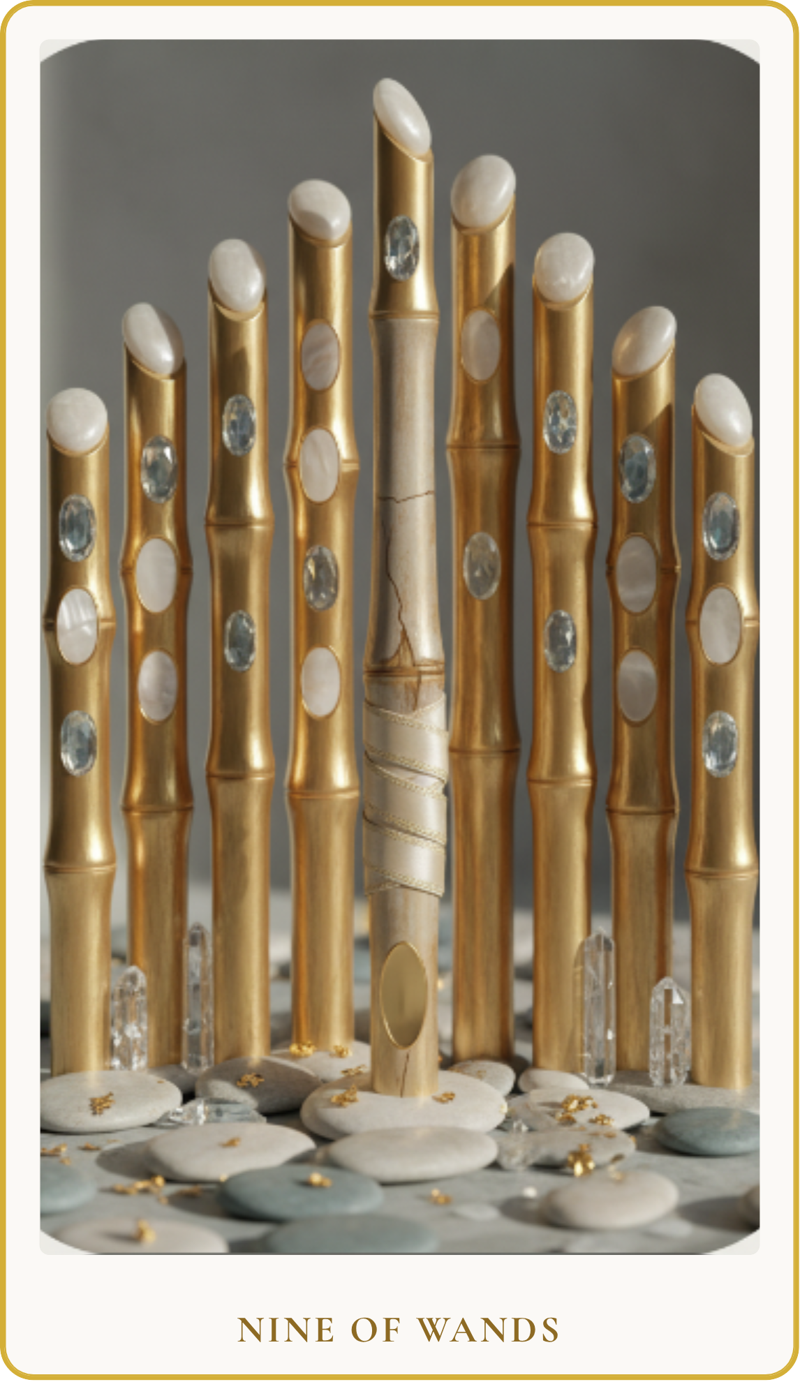 The Nine of Wands depicts a figure, wounded but resolute, clutching a wand as they survey a defensive line of eight other wands. This card speaks to resilience, endurance, and the final stand. It signifies having overcome numerous trials and emerging stronger, though perhaps a little bruised. You are on the precipice of a breakthrough, but you recognize that one more challenge, one final push, may be required. It’s a call to trust your inner strength and the wisdom gained from past experiences as you prepare to defend your boundaries or see a long-term project through to completion, demonstrating steadfast courage despite the visible weariness.