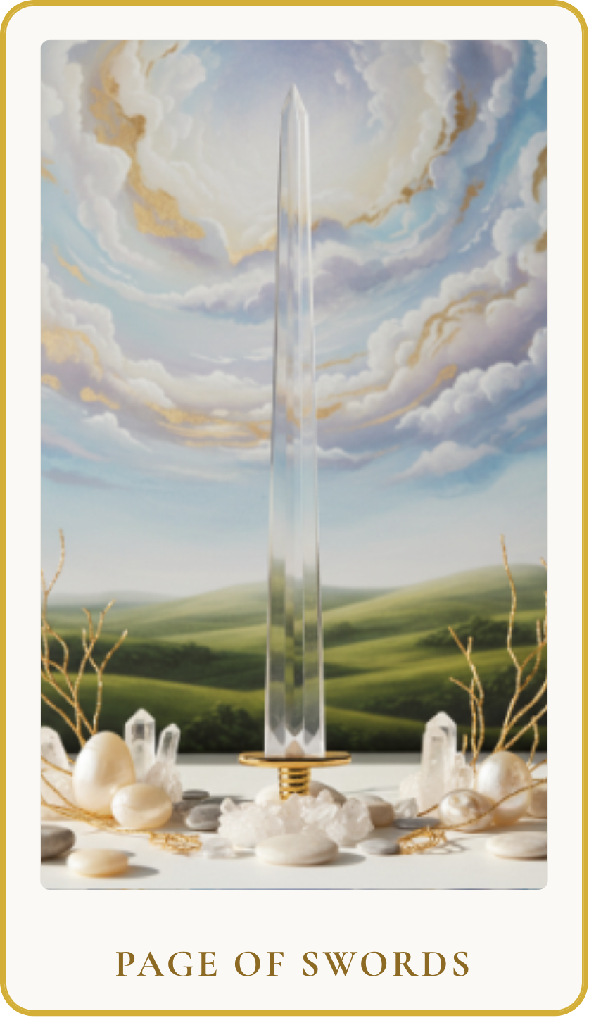 The Page of Swords heralds a fresh burst of intellectual curiosity and a desire for truth. This card represents the initial spark of an idea, the first foray into a new subject, or the development of a keen, inquisitive mind. It embodies the energy of a student, a messenger, or someone bravely speaking their mind, often with a raw and unfiltered honesty. The Page of Swords encourages asking questions, investigating, and approaching situations with a sharp, analytical perspective, ready to learn and to challenge the status quo.