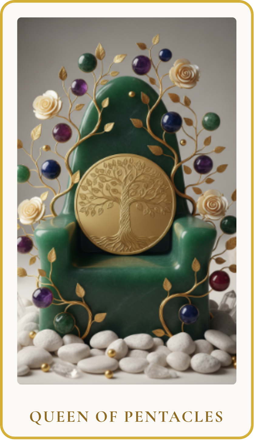 The Queen of Pentacles embodies a deeply nurturing, practical, and grounded energy. She represents the archetype of the provider and caretaker, someone who creates a stable and comforting environment for themselves and others. Her presence signifies a connection to the material world, emphasizing abundance, security, and the responsible management of resources. She teaches us to find joy and comfort in the physical realm, fostering well-being through practical wisdom and heartfelt generosity.