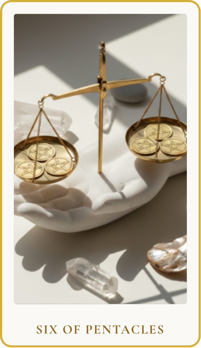 For career and finance, the upright Six of Pentacles is a positive indicator of financial stability, fair compensation, and opportunities for growth through support. You might receive a bonus, a well-deserved raise, a scholarship, or a loan that significantly aids your financial situation. It also represents philanthropy in business, such as charitable giving or ethical investment. In the workplace, it points to a supportive environment where colleagues or superiors offer help, mentorship, or resources. Business dealings are likely to be fair and transparent, ensuring that all parties receive their just due.