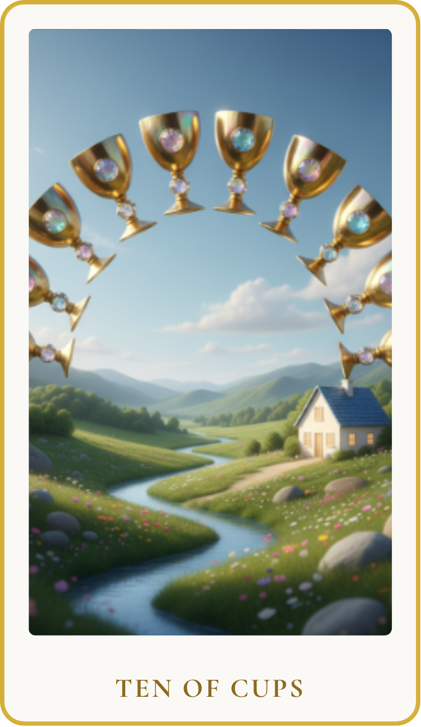 In a love reading, the Ten of Cups upright is one of the most positive cards to receive. It signifies deep emotional connection, lasting commitment, and a harmonious partnership that often leads to marriage, a stable family, and a happy home life. For those in a relationship, it suggests a bond built on mutual love, respect, and shared values, moving towards a future filled with joy and emotional security. For singles, it can indicate the imminent arrival of a soulmate connection or a relationship that offers genuine emotional fulfillment and the prospect of building a loving family. This card represents a profound sense of belonging and finding your "person," leading to a deeply satisfying and stable romantic future.