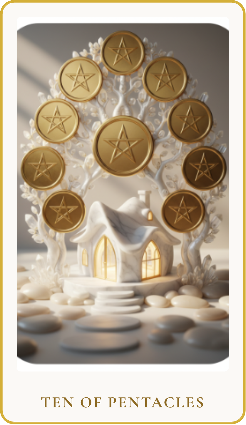 At its core, the Ten of Pentacles speaks to enduring wealth, generational prosperity, and the joy found in a secure home and family life. It illustrates the idea of building something tangible and meaningful that will stand the test of time, providing comfort, safety, and a foundation for those who come after.