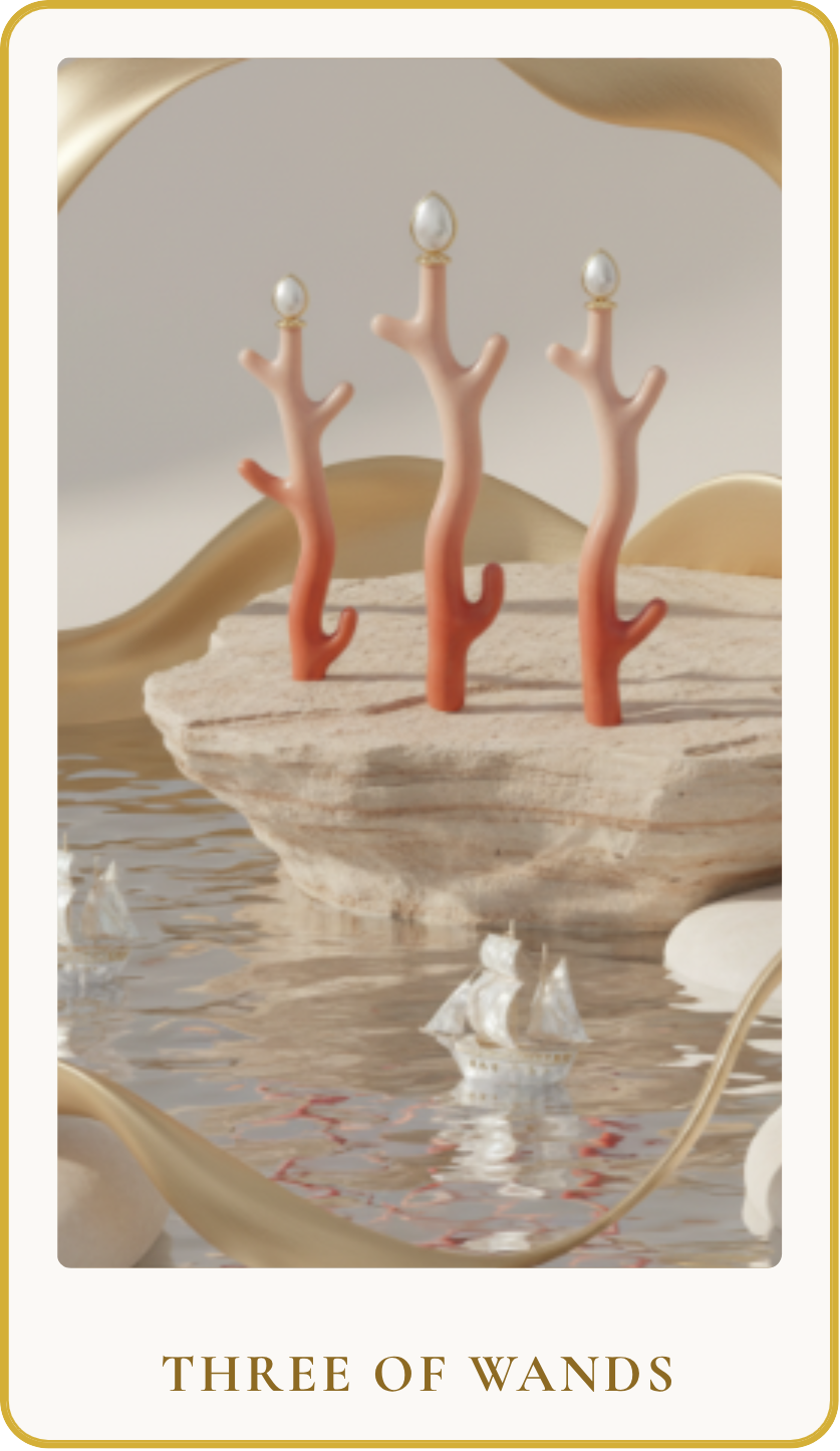 The Three of Wands signifies a pivotal moment of expansion and foresight. After the initial spark of inspiration from the Ace and the collaborative planning of the Two, this card represents the successful establishment of a foundation and the act of looking out towards new horizons. It embodies the vision required to move beyond immediate efforts, suggesting that your previous actions are beginning to bear fruit, and it’s time to prepare for the next phase of growth.