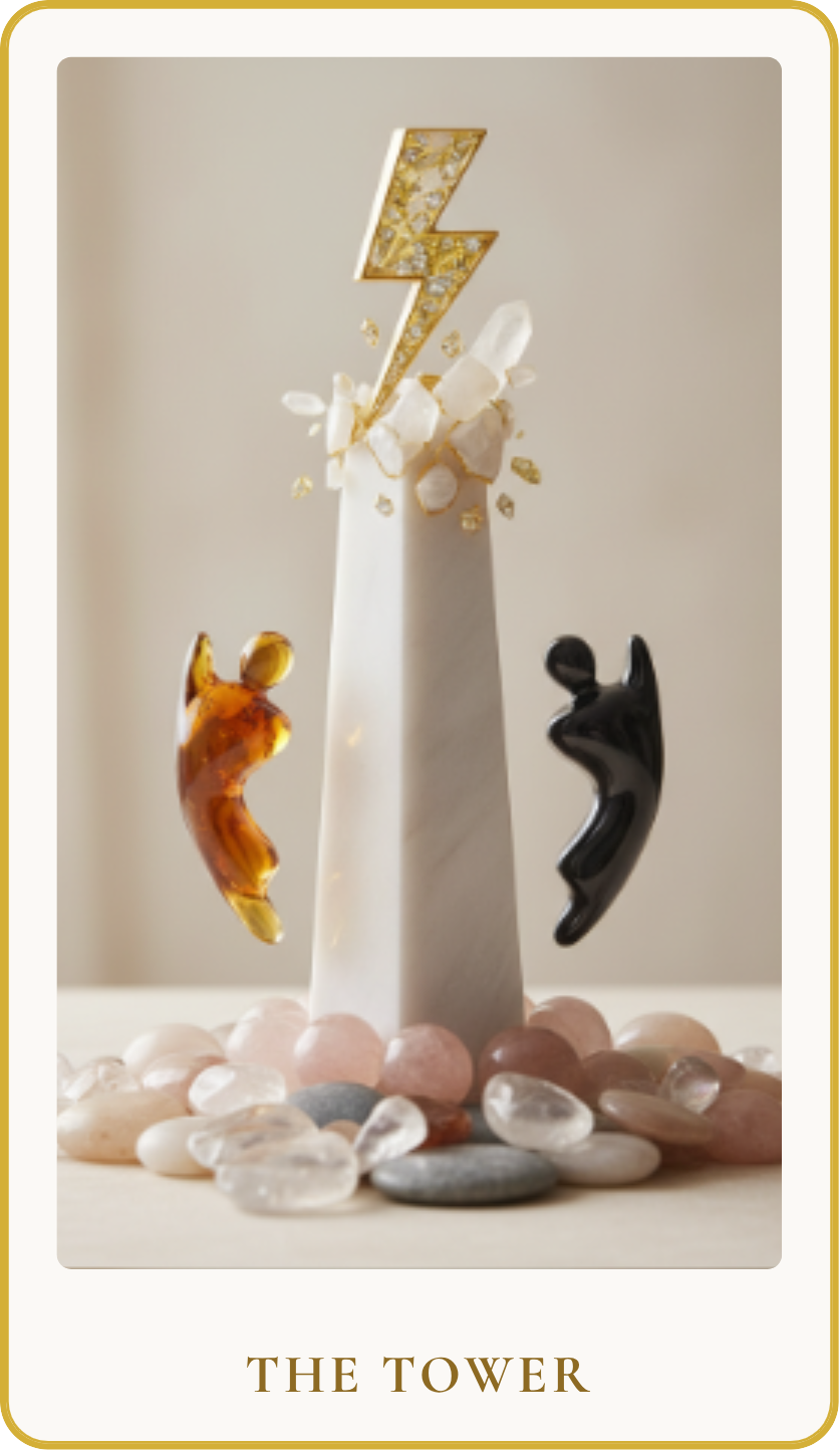 In love readings, The Tower upright often signals a sudden, dramatic end to a relationship, a shocking revelation about a partner, or an unexpected event that fundamentally alters the dynamics of a partnership. This could be an abrupt breakup, divorce, or a deep-seated argument that clears the air, leading to a complete redefinition of the relationship. While painful, this collapse clears away illusions or unhealthy patterns, forcing both parties to confront reality. For singles, it can mean breaking free from old, self-limiting beliefs about love, or an unexpected event that forces a re-evaluation of what you truly seek in a partner.