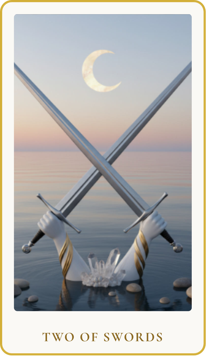 The Two of Swords represents a moment of indecision, stalemate, or a difficult choice. It often depicts a blindfolded figure holding two crossed swords, perfectly balanced, with a calm sea behind them and a crescent moon in the sky. This imagery speaks to an intellectual impasse, where conflicting thoughts or emotions create a mental block.