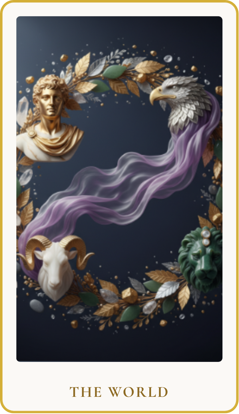 Visually, the card often features a dancing figure within a laurel wreath, surrounded by four figures representing the elements or the four evangelists. This imagery underscores the integration of all aspects of self and experience, symbolizing a perfect balance and a victorious conclusion to a long effort or spiritual quest. It's the moment of celebrating the successful navigation of life's challenges and embracing the rewards of perseverance.